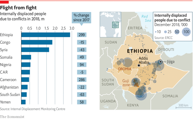 FOR MANY years Ethiopia struggled with drought and starvation, creating a population that moved frequently in search of food and water. Now it is violence that millions of Ethiopians are fleeing. Last year it topped the list of countries with displaced people, according to the Internal Displacement Monitoring Centre (IDMC), an NGO.
